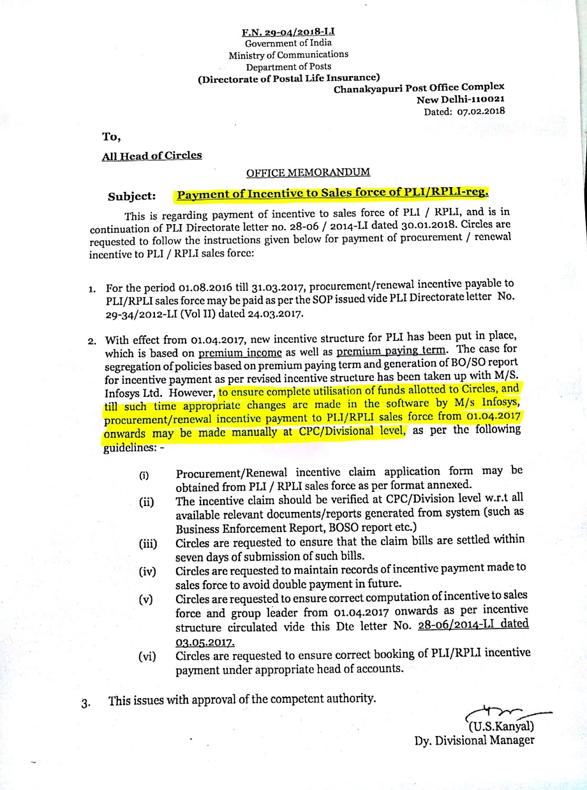 Payment of Incentive to Sales force of PLI/RPLI - Reg : Department of Posts